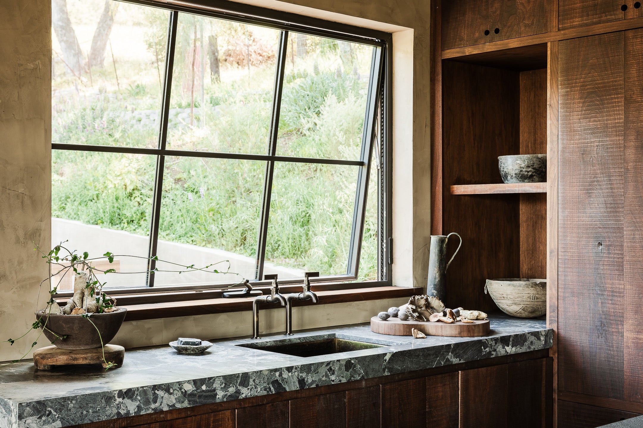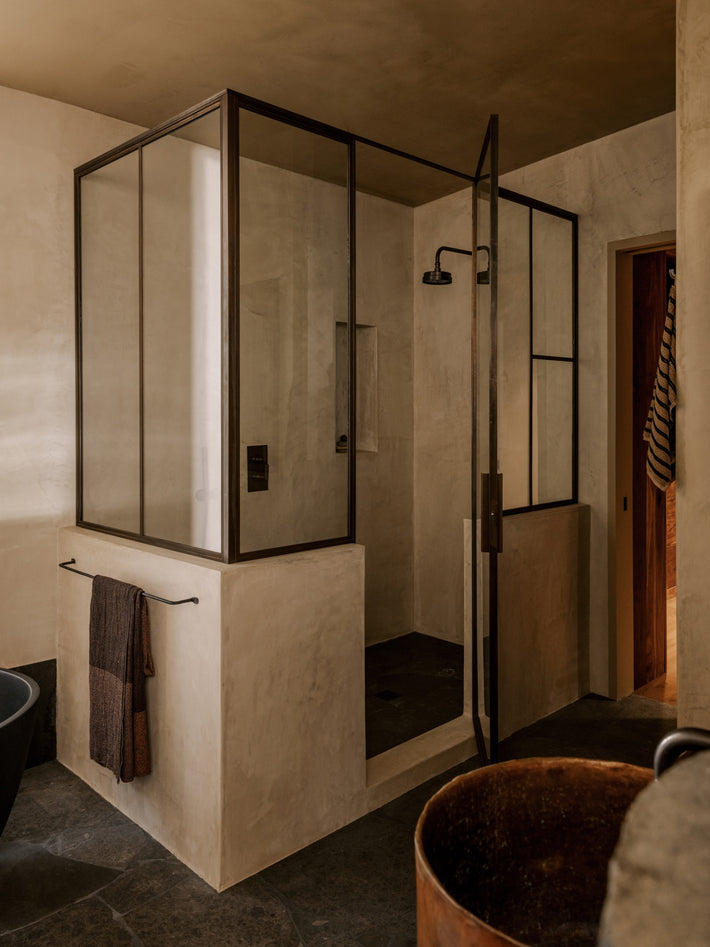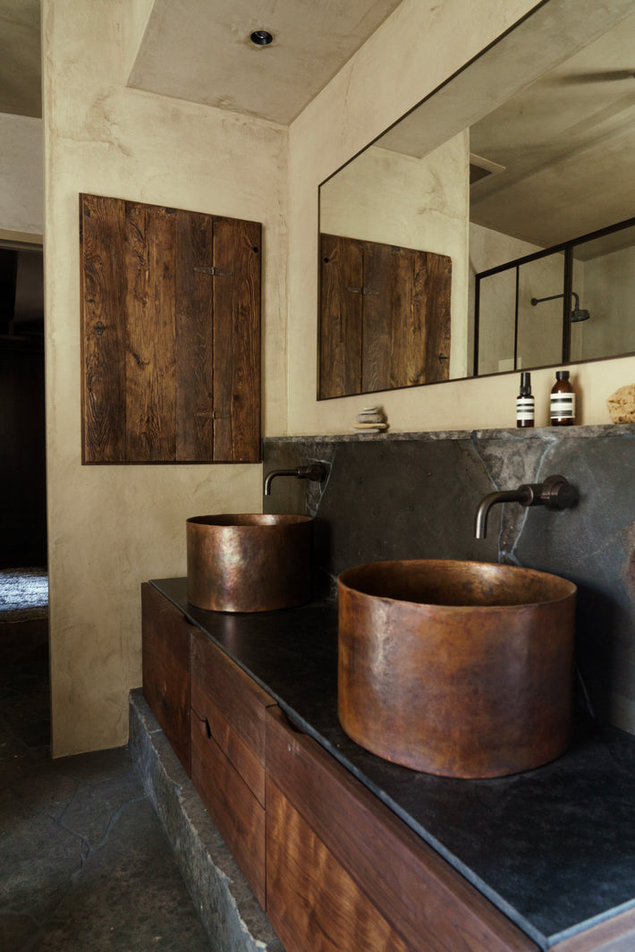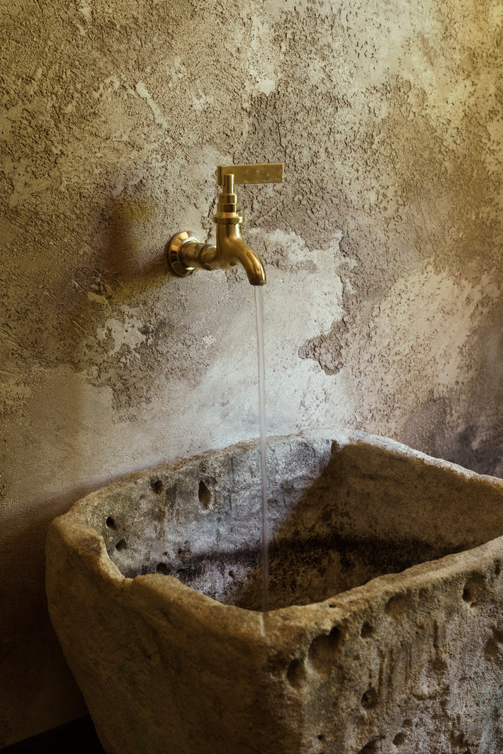 Unlacquered polished brass, which will patina over time. And lacquered bronze on the kitchen bib taps, a darker tone that holds. Both sit with the stone, the wood, the canyon light. Warm tones in a house built to feel elemental.